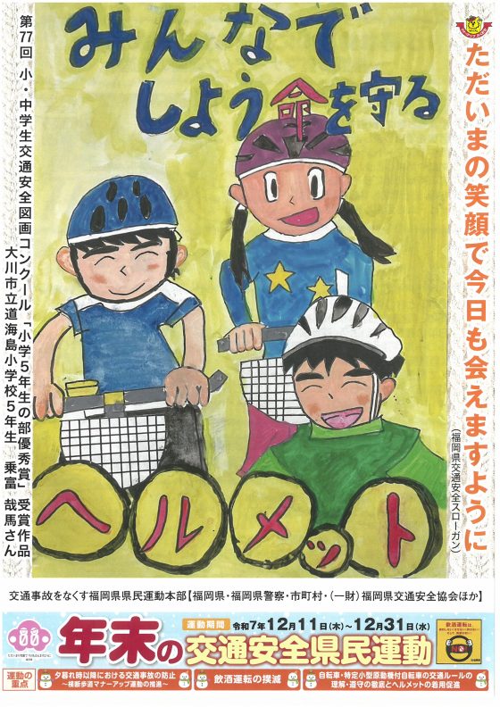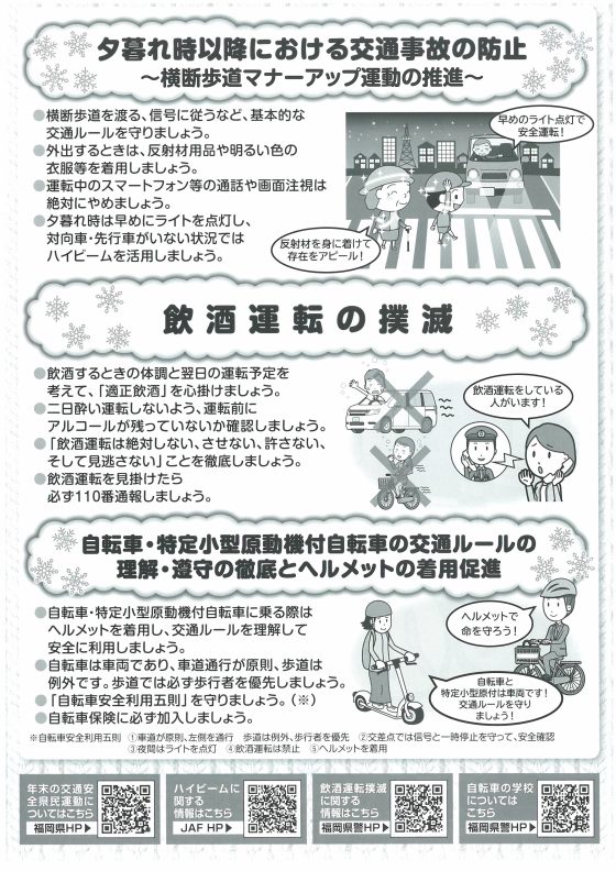 2025.12.11 お知らせ 年末の交通安全県民運動実施中 福岡県では年末の交通安全県民運動を実施中です。 期間 令和7年12月11日(木)~12月31日(水) 期間中は、より一層の安全運転、交通事故防止を心がけましょう。 お知らせ一覧へ